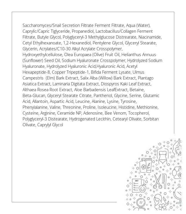 Formulated with Snail Secretion Filtrate Ferment Filtrate, Bee Venom, Collagen Ferment Filtrate, Hyaluronic Acid and Peptides, this efficacious anti-wrinkle Snail Bee Ultmate Eye Cream helps smooth under eye texture, improve elasticity and visibly reduce wrinkles, fine lines and crow’s feet in the eye area. Peptides, Amino acids and Ceramides help strengthen your skin's barrier. Niacinamide is an effective skin lightening compound that work to improve uneven skin tone. Adenosine decreases the appearance of wrinkles, resulting in a smoother, more youthful complexion. A high concentration of fermented ingredients ensures a visible boost to your skin's elasticity to promote the look of smooth and radiant skin! It is easy to spread and does not leave skin feeling heavy or greasy. Suitable for all skin types.